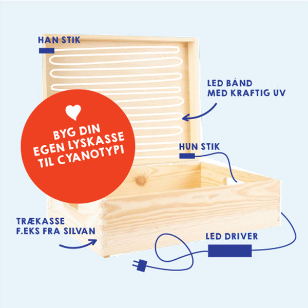 Jeg netop fået noget kraftigt UV LED bånd hjem som egner sig supergodt til belysning af egne serigrafi-rammer eller cyanotypier. Jeg har installeret UV-lyset i en fin trækasse fra Silvan og har fået min helt egen belysningskasse. Byg din egen, det er nemt nok. Lyset købes her i min webshop og så mangler du bare kassen :-)