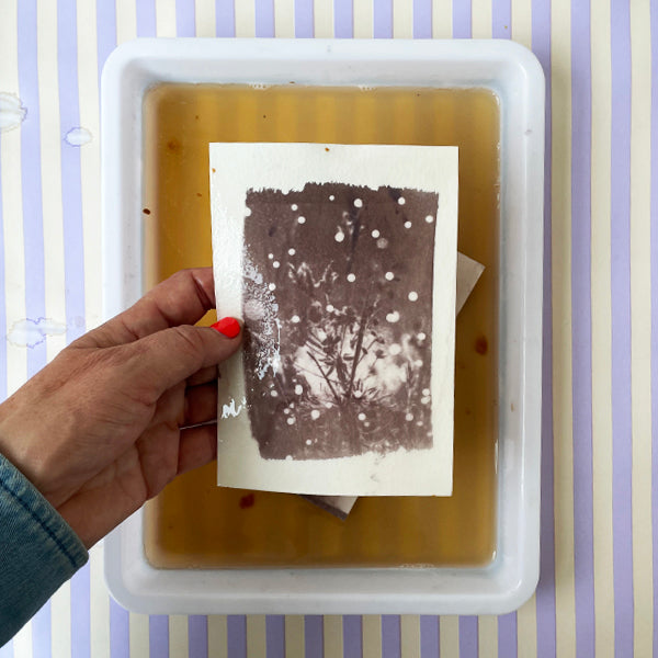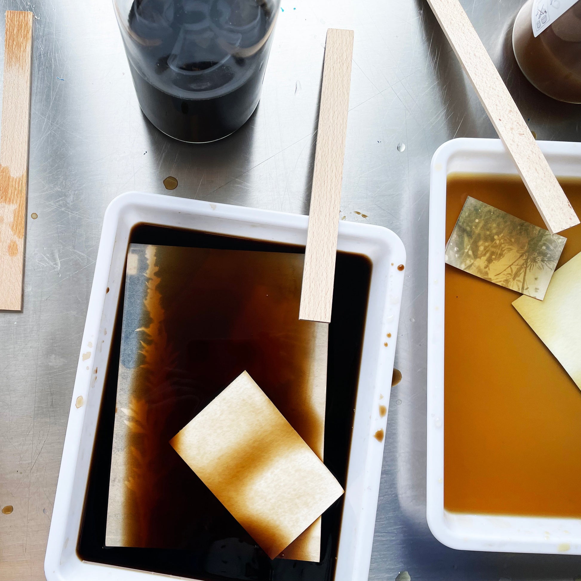 Et cyanotypi er jo kendetegnet af den blå farve, men ved efterbehandlet er det muligt at indarbejde andre toner i dine værker. Jeg viser hvordan du både kan farve direkte ovenpå den blå med naturlige farvestoffer og hvordan du kan blege, åbne fibrene i papiret og opnå helt nye farver i dine værker. På kurset for du alle opskrifterne på de forskellige toninger, så du nemt kan fortsætte arbejdet på egen hånd.