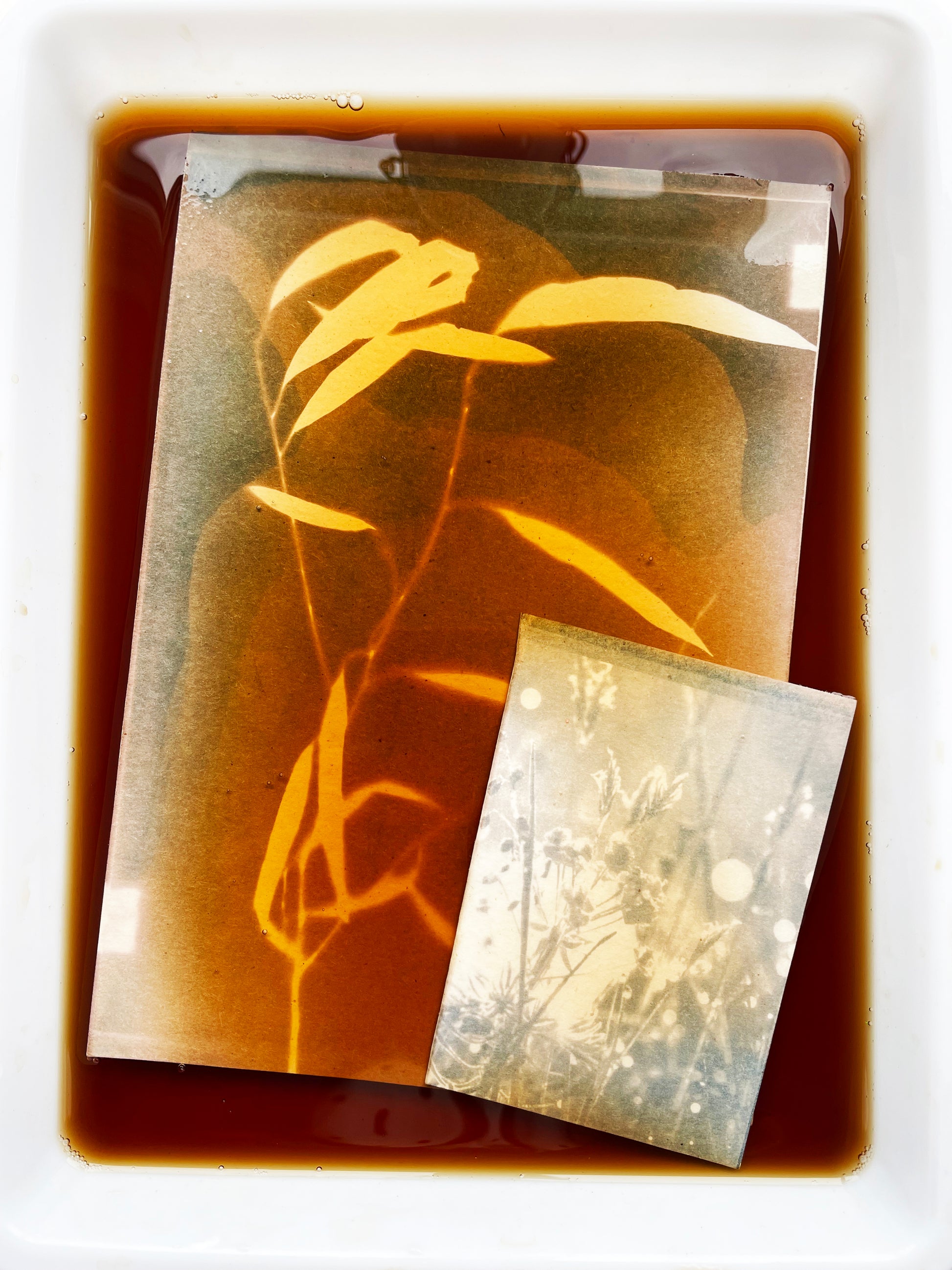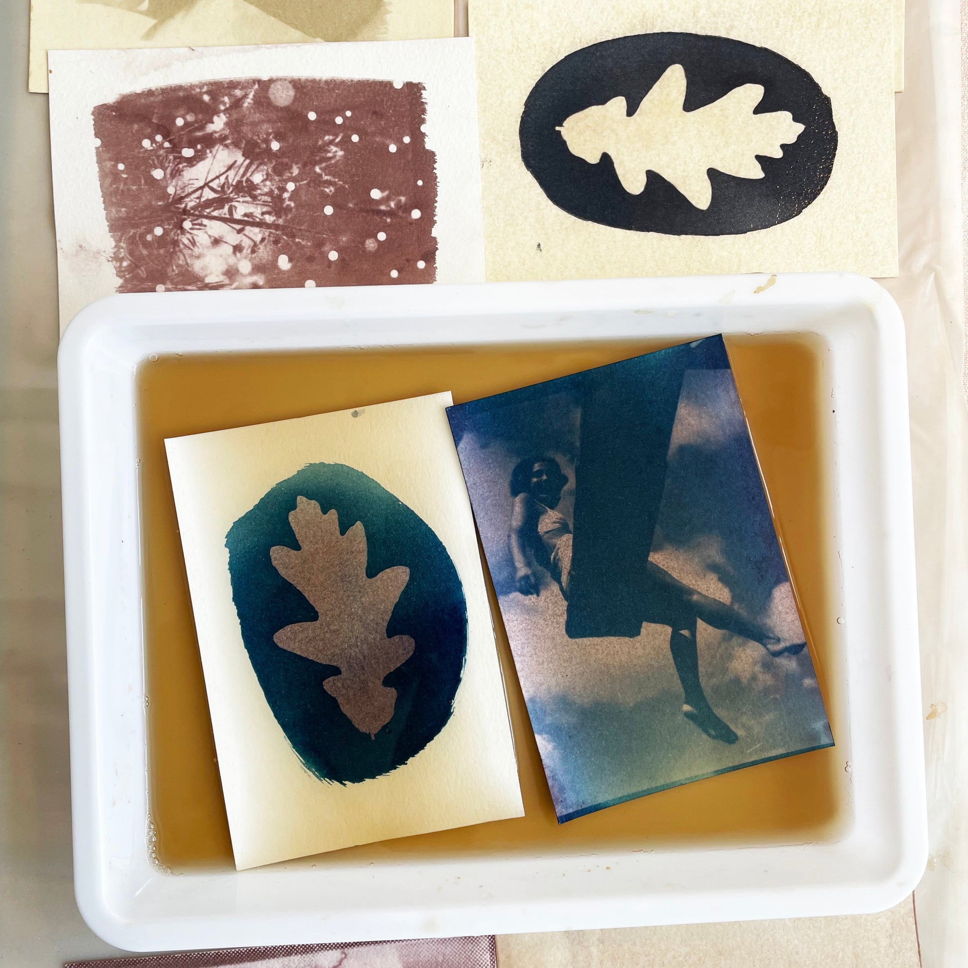 Toning i cyanotypi åbner også op for arbejdet med to farver i samme billede og jeg viser forskellige eksempler på det til inspiration til eget arbejde.